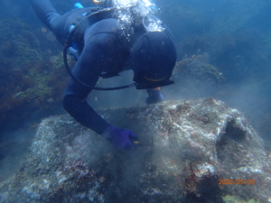 昨日は、久しぶりの雨だった伊豆大島。なので天草漁はお休みです。そこで、うみのわスタッフは久しぶりに水中撮影をメインに、秋の浜に潜って来ました。何日ぶりのファンダイビングになるのか、忘れてしまったほど潜っていませんでした。まぁ、漁で海には潜っているんですけどね…。