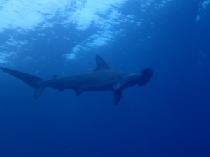 深場から上がってくるハンマーに気が付いたのですが、デジカメが手に付かず…。撮影準備が出来た時には時すでに遅しで、後姿を数秒しか撮影出来ませんでした。せっかくコバンザメの仲間が2匹ついていたのに…(泣)