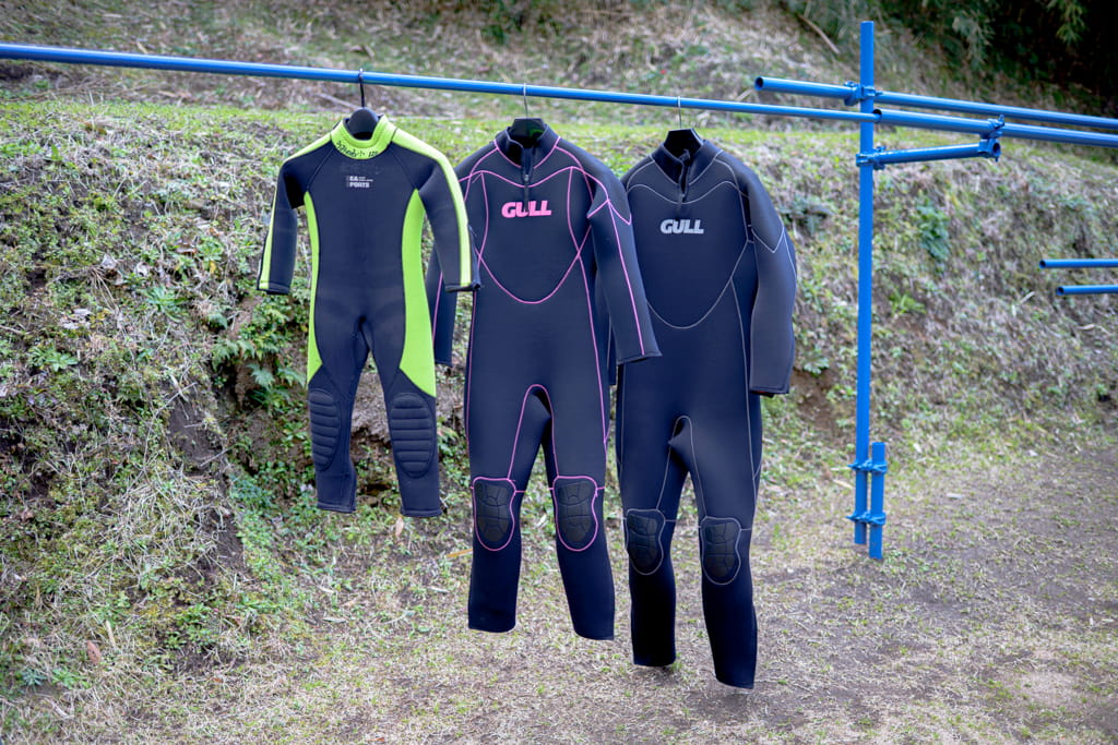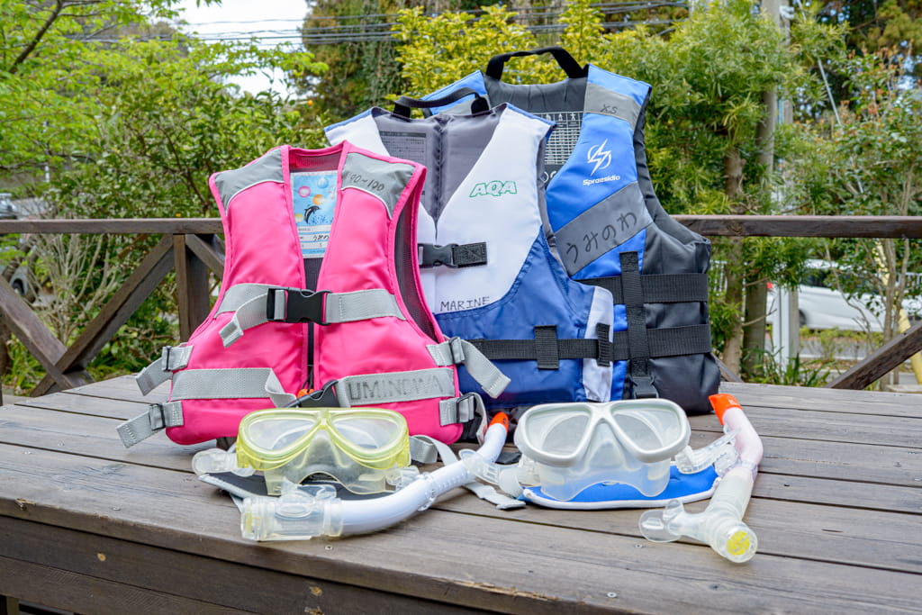 保温性と浮力が高く、少し海が冷たくても問題なく海を泳げるウエットスーツ、水面に楽に浮いていられ、安全性が高いフローティングベスト(ライフジャケット)もサイズ豊富にご用意しております。